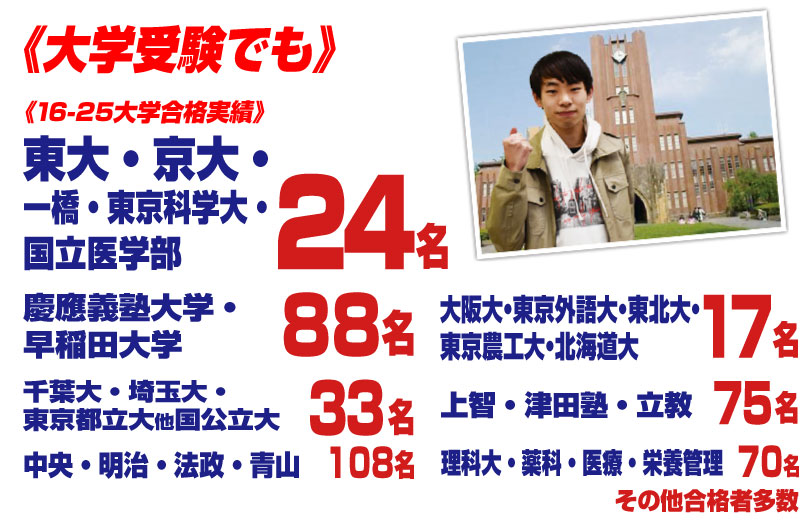 小中高一貫で全国レベルに通じる合格力を育成するラサールでは、小学校低学年からの基本に重点を置いた指導で、学力重視となった学校の学習にしっかりと対応できる学力を養い、内申重視の中学の学習に対処していきます。その結果として、浦高・一女などをはじめとする難関校・トップ校へ毎年多数の合格者を送り出しているのであり、浦高・一女などから東大・京大・一橋・東工大・東京医科歯科大・千葉/群馬大他国立大医学部・早慶などをはじめとする難関・最難関大への毎年多数の現役合格者を送り出しているのです。このようなすばらしい成果のすべては、この小中学生の時からの学習を通じて培われる本物の学力、学習の厚味の結果なのです。