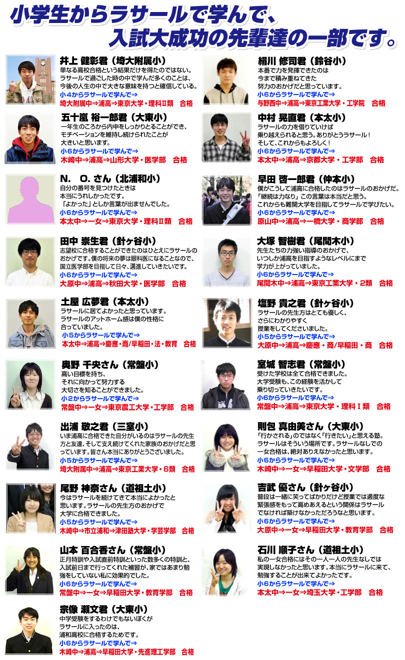 さいたま市内のトップレベルの生徒さんが切磋琢磨するラサールで学習すれば、全県レベル、全国レベルに通じる合格力育成が容易に可能となります。ラサールの小・中・高一貫指導、詳細はお問い合せ下さい。