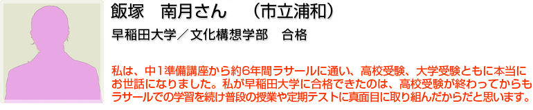今でも合格した実感が湧かないほど自分が合格した事実を受け止められないでいます。メンタルが受験直前に崩壊し、入試前日に本気で浪人を覚悟していたので入試本番のコンディションは最悪でした。それでも本番で力を発揮できたのは今まで積み重ねてきた努力のおかげだと思っています。ラサールでは数学を受講しており、増田先生には大変お世話になりました。増田先生には数学だけでなく物の考え方、精神的なことまでいろいろ教わりました。工学院は第一志望学院ではありませんでしたが、それでもこうして合格できているのは増田先生をはじめとするラサールの先生方のお力添えもあったからであると思います。少し進路を狭めすぎていた面があったので大学に入ってから自分の人生を見つめ直して後悔のない人生を歩みたいと思います。長い間ありがとうございました。 |