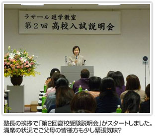 10月17日(土) ラサール進学教室の「第2回高校受験説明会」をクィーンズ伊勢丹の3階カルタスホールにて実施しました。 当日は2010年からの新制度入試について、09年度の入試データを元にシミュレーションした結果、さいたま市近辺の県公立高校は軒並み2.5倍〜3倍を上回る競争倍率となることが予想され非常に厳しい入試状況になること、さらに、来年度の入試スケジュールでは1月の併願私立受験後、本命の公立前期募集までわずか3週間しか残された時間がなく、入試学力の年内完成が合格の絶対条件となることなど2010年入試を勝ち抜く要点が説明されました。 また、満足のいく滑り止めの私立高校合格を勝ち取らせるための「ラサール推薦」についても各高校ごとの具体的な偏差値からその手順に至るまで細かく説明され、ご父母の皆様は各高校の偏差値に一喜一憂しながらもしっかり聞いておられました。 最後に来春の合格発表日にご一緒に喜び合いましょう!とお約束し終了いたしました。 受験生の皆さん、明春の合格を目指して一緒に頑張りましょう!!